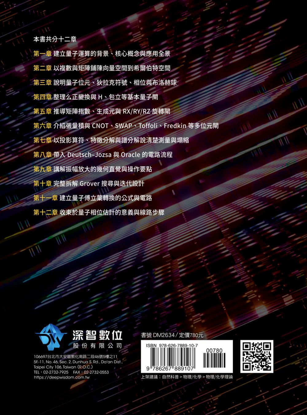 本書共分十二章 第一章 建立量子運算的背景、核心概念與應用全景 第二章 以複數與矩陣鋪陳向量空間到希爾伯特空間 第三章 說明量子位元、狄拉克符號、相位與布洛赫球 第四章 整理么正變換與 H、包立等基本量子閘 第五章 推導矩陣指數、生成元與 RX/RY/RZ 旋轉閘 第六章 介紹張量積與 CNOT、SWAP、Toffoli、Fredkin 等多位元閘 第七章 以投影算符、特徵分解與譜分解說清楚測量與塌縮 第八章 帶入 Deutsch–Jozsa 與 Oracle 的電路流程 第九章 講解振幅放大的幾何直覺與操作要點 第十章 完整拆解 Grover 搜尋與迭代設計 第十一章 建立量子傅立葉轉換的公式與電路 第十二章 收束於量子相位估計的意義與線路步驟 |