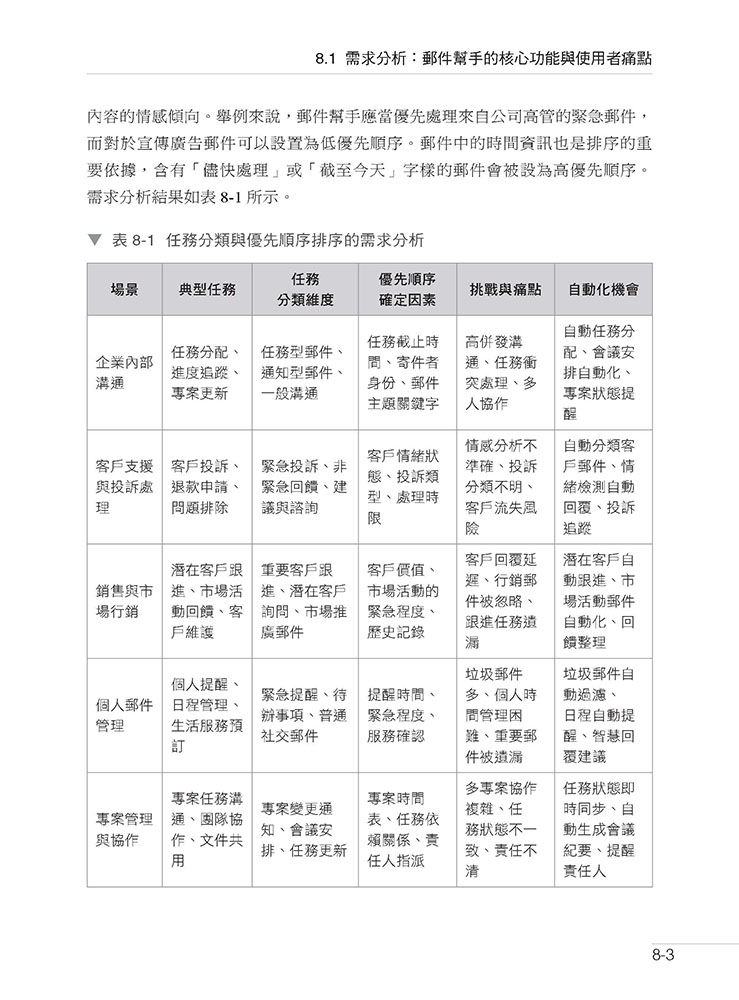 ▌第三部分 代理深度開發 ►第8 章 秒回郵件:智慧郵件助理 8.1 需求分析:郵件幫手的核心功能與使用者痛點 8.1.1 任務分類與優先順序排序的需求分析 8.1.2 使用者需求的多樣化與場景適應性設計 8.2 實現多工郵件管理的技術架構 8.2.1 非同步任務佇列與高併發處理架構設計 8.2.2 郵件分類與儲存結構的最佳化設計 8.2.3 API 介面與郵件伺服器的無縫整合設計 8.2.4 多使用者管理與許可權控制的實現架構 8.3 整合LLM 處理自然語言郵件回覆 8.3.1 LLM 在多輪對話中的語境保持 8.3.2 客製化與情感分析在郵件回覆中的應用 8.3.3 範本化與自訂敘述生成的實現設計 8.3.4 錯誤處理與異常情況的回覆策略 8.4 客製化最佳化:學習使用者風格的郵件寫作 8.4.1 使用者行為追蹤與語言模型的訓練最佳化 8.4.2 自我調整客製化郵件範本的設計與實現 8.5 本章小結 8.6 思考題