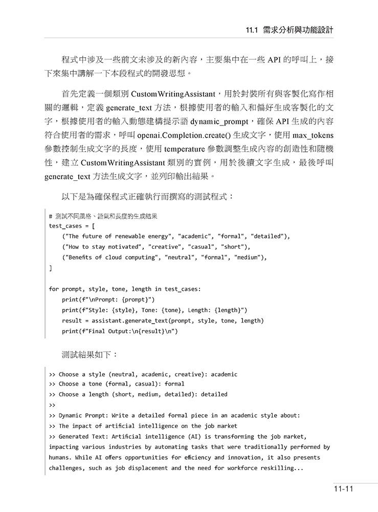 ►第11 章 專業撰稿人:智慧寫作幫手 11.1 需求分析與功能設計 11.1.1 內容生成的應用場景與需求挖掘 11.1.2 多語言支援與語義校準的必要性 11.1.3 客製化寫作與使用者偏好訂製 11.2 模組設計與核心演算法:架設智慧寫作系統的邏輯框架 11.2.1 內容生成與續寫演算法的實現原理 11.2.2 多輪互動與上下文保持策略 11.3 程式實現與系統部署 11.3.1 智慧寫作系統的核心程式實現 11.3.2 API 整合與功能擴充方案 11.3.3 系統部署與性能最佳化 11.4 本章小結 11.5 思考題