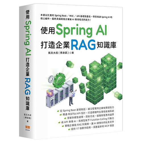 本書的學習架構 本書採用循序漸進的學習路徑,協助您從無到有建構企業級 AI 應用: 第一部分:Spring Boot 基礎 ● 建立堅實的 Spring Boot 開發基礎。 ● 掌握現代 Java 企業級開發的核心技能。 ● 理解 Spring AI 背後的依賴注入與配置原理。 第二部分:Spring MVC 與 API 開發 ● 學習建立標準化的 RESTful API。 ● 掌握請求處理、回應格式化和全域錯誤處理。 ● 為 Spring AI 的 Function Calling 和 MCP Server 奠定 HTTP 通訊基礎。 本書定位說明:現代開發以前後端分離為主流。Spring Boot 專注於提供 RESTful API(JSON 資料交換),前端 View 層交由 React/Vue/Angular 處理。因此,本書不探討 JSP 或 Thymeleaf 等傳統模板技術,而是專注於 API 開發 與 AI 整合,這才是企業級 AI 後端的關鍵戰場。 第三部分:生產級 API 開發實踐 ● 深入資料驗證、安全性防護與檔案處理。 ● 掌握 API 測試策略與 Swagger/OpenAPI 文件自動生成。 ● 打造強健的生產級後端系統。 第四部分:Spring AI 實戰 ● 深入 Spring AI 核心組件。 ● 建構實際的企業級 RAG 知識庫系統。 ● 整合多模態 AI 服務與工具鏈。