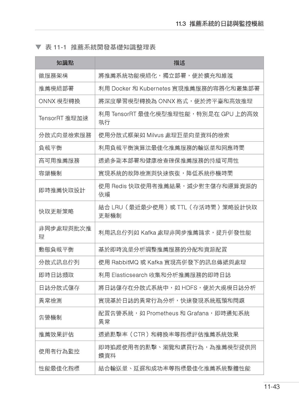 ►第11 章 推薦系統開發基礎 11.1 推薦系統的分散式架構設計 11.1.1 微服務框架下的推薦模組部署 11.1.2 ONNX 模型轉換與TensorRT 推理加速 11.1.3 分散式向量檢索服務的負載平衡 11.1.4 高可用推薦服務容錯與恢復機制 11.2 推薦服務的高併發最佳化 11.2.1 即時推薦服務的快取機制設計 11.2.2 非同步處理與批次推理的性能提升 11.2.3 動態負載平衡在推薦服務中的應用 11.2.4 使用分散式訊息佇列最佳化高併發推薦串流 11.3 推薦系統的日誌與監控模組 11.3.1 即時監控系統性能與使用者行為資料 11.3.2 日誌擷取與分散式儲存架構 11.3.3 異常檢測與告警系統 11.3.4 推薦效果評估回饋 11.4 本章小結 11.5 思考題
