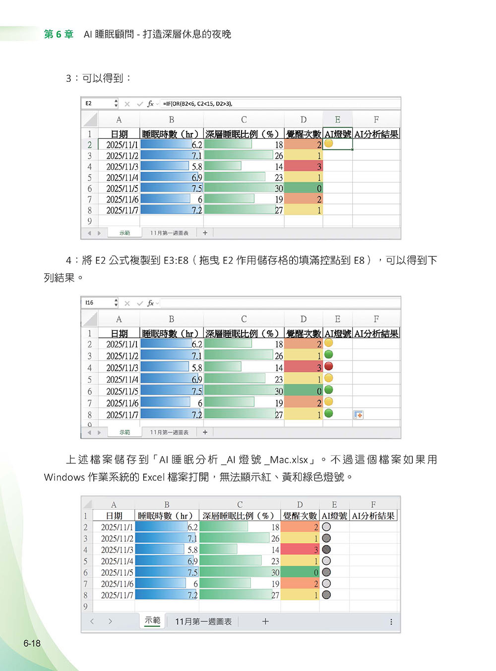 ▌第6 章 AI 睡眠顧問 - 打造深層休息的夜晚 6-1 手環與AI 連動 - 解讀睡眠長短與深眠比例 6-1-1 補充解釋快速動眼期 6-1-2 智慧手環的角色 6-1-3 AI 如何解析睡眠數據 6-1-4 從「數據」走向「行動」 6-1-5 重點回顧 6-1-6 小結 6-2 用 AI 生成「睡眠趨勢圖」與「改善建議」 6-2-1 從「手環資料」到「AI 報告」 6-2-2 建立「AI 睡眠分析.xlsx」表單 6-2-3 建立「睡眠時數」與「深層睡眠比例」的組合圖表 6-2-4 用「資料橫條」呈現睡眠時數與深層睡眠比例 6-2-5 夜間醒來次數 - 睡眠穩定度的隱形指標 6-2-6 AI 燈號 6-2-7 AI 分析結果 - 看懂數據背後的訊號 6-3 ChatGPT 助眠故事 - 用語言引導大腦進入放鬆模式 6-3-1 為什麼助眠故事有效?睡眠科學給出的答案 6-3-2 ChatGPT 助眠故事的三大特色 6-3-3 給 ChatGPT 的助眠提示詞實例 6-3-4 睡前 10 分鐘的「切換儀式」 6-3-5 小結 6-4 Suno 助眠音樂 - 用聲音為大腦鋪一條入睡的路 6-4-1 為什麼用 Suno 來做「助眠音樂」 6-4-2 助眠音樂的設計原則 6-4-3 Suno 助眠音樂的提示詞實例 6-4-4 如何把 Suno 助眠音樂融入你的睡前流程 6-4-5 與 AI 燈號系統的結合 6-5 建立「睡前 30 分鐘無螢幕計畫」 - 讓大腦正式進入夜間模式 6-5-1 為什麼一定要「睡前 30 分鐘無螢幕」 6-5-2 「睡前 30 分鐘無螢幕計畫」的三階段流程 6-5-3 無螢幕 30 分鐘的 AI 實作工具 6-5-4 「無螢幕計畫」與 AI 燈號的關聯 6-5-5 這 30 分鐘,是你給自己的「靜夜禮物」