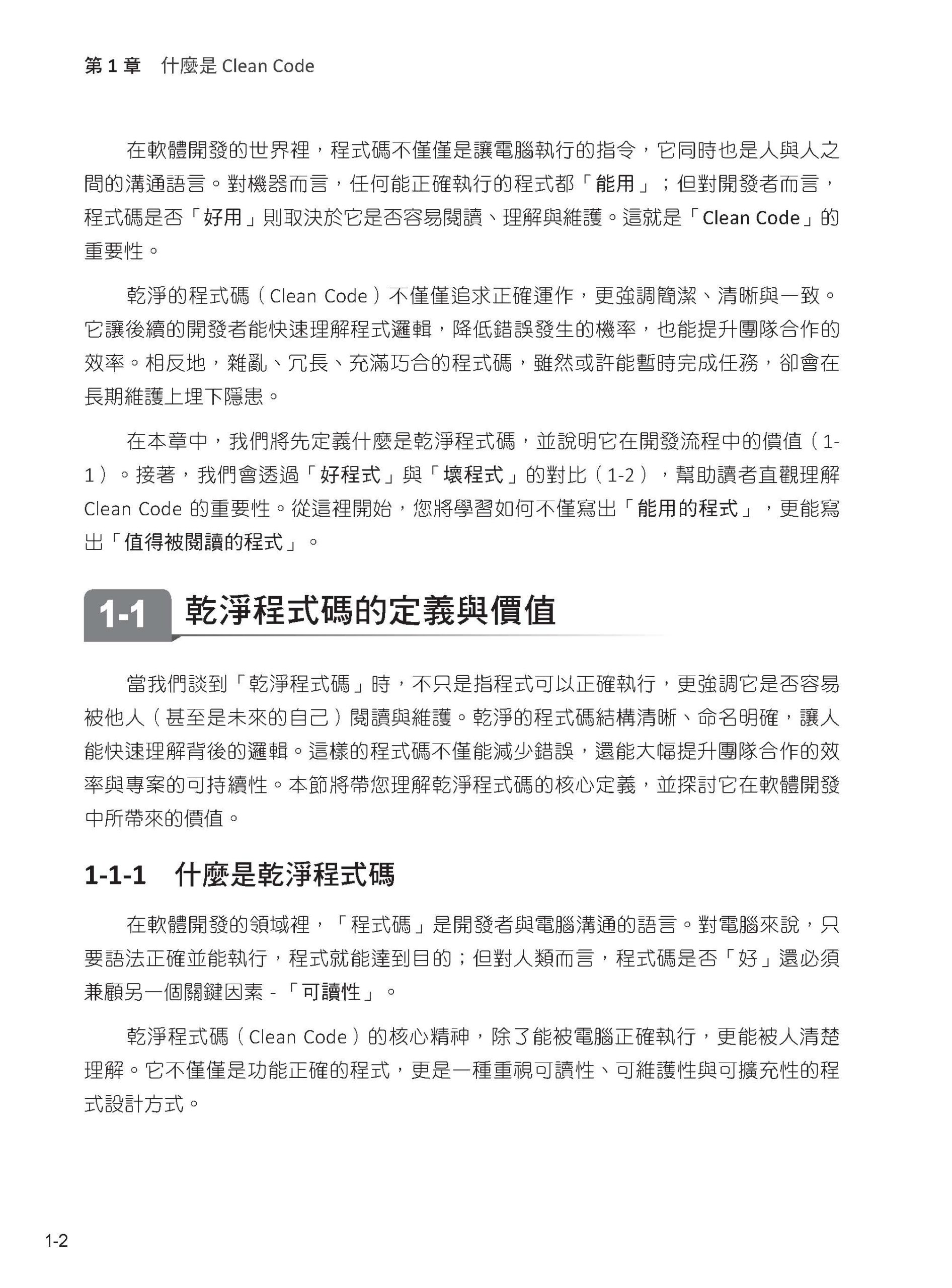 ▌1-1 乾淨程式碼的定義與價值 1-1-1 什麼是乾淨程式碼 1-1-2 乾淨程式碼的核心特徵 1-1-3 為什麼需要乾淨程式碼 1-1-4 乾淨程式碼與技術債 ▌1-2 好程式與壞程式的對比 1-2-1 壞程式碼的典型特徵 1-2-2 好程式碼的特徵 1-2-3 案例對比 - 從壞程式到好程式 1-2-4 從對比中學到的啟示