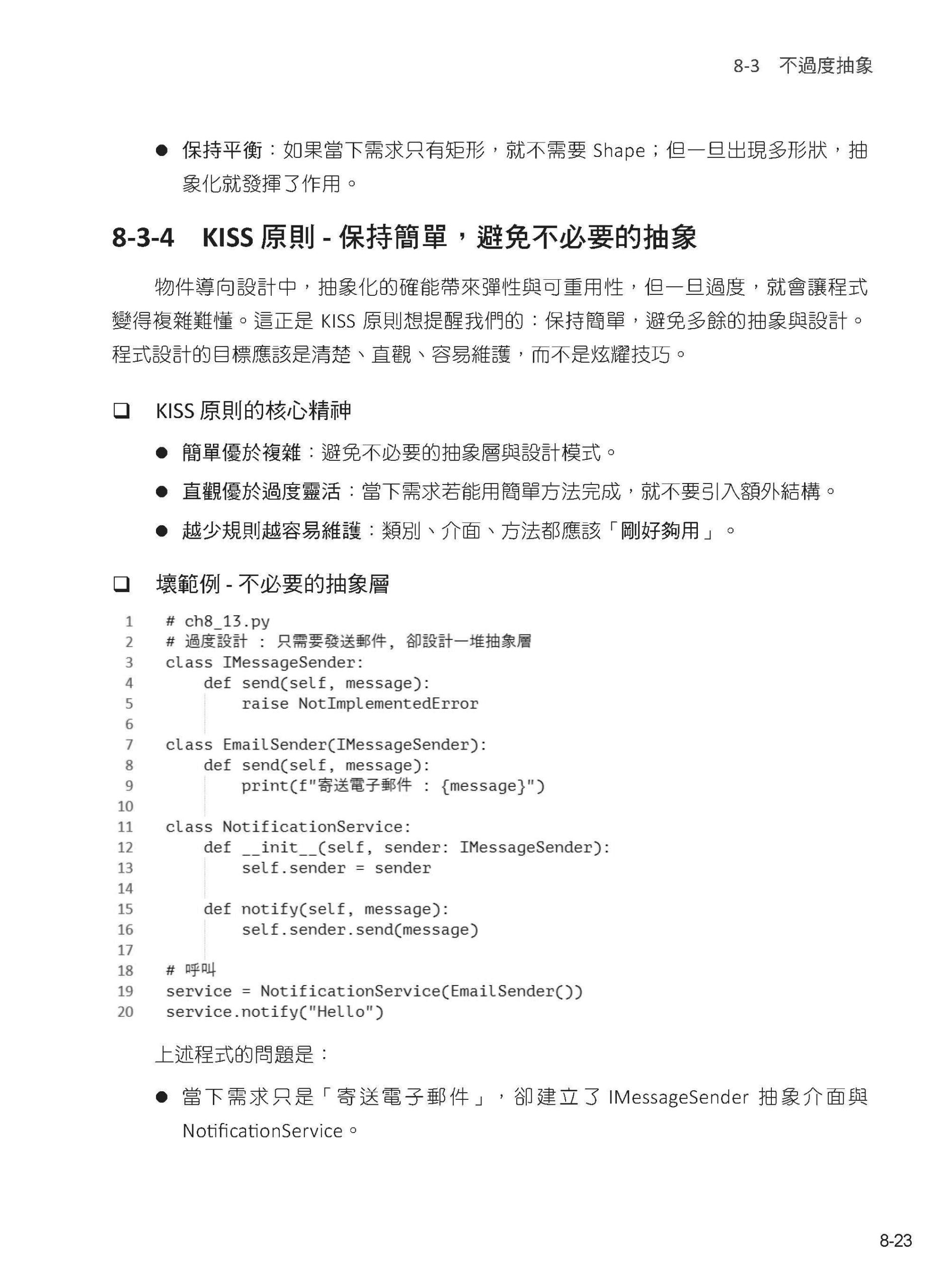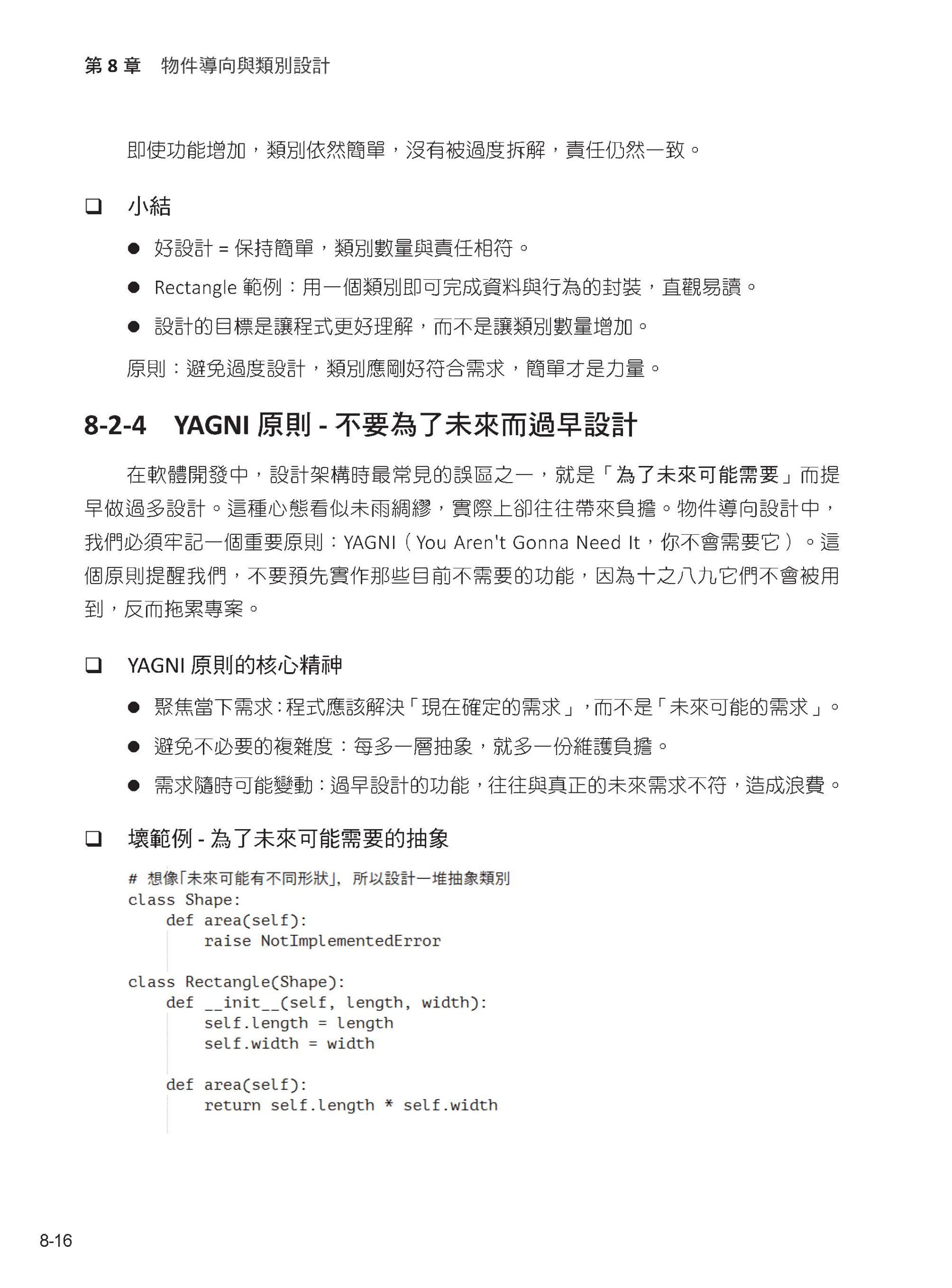 第8章 物件導向與類別設計 ▌8-1 善用 class 與 method 的封裝性 8-1-1 類別的核心價值 - 資料與行為的結合 8-1-2 為什麼要使用封裝 8-1-3 壞範例 - 所有邏輯寫在全域函數 8-1-4 好範例 - 使用類別封裝資料與操作 8-1-5 善用公開方法與私有方法的分工 ▌8-2 不過度設計 8-2-1 什麼是過度設計 8-2-2 壞範例 - 單純功能卻被拆成過多類別 8-2-3 好範例 - 保持設計簡單,類別數量與責任相符 8-2-4 YAGNI 原則 - 不要為了未來而過早設計 ▌8-3 不過度抽象 8-3-1 抽象化的價值與風險 8-3-2 壞範例 - 不必要的繼承或介面層 8-3-3 好範例 - 在必要時才抽象,保持彈性與可讀性。 8-3-4 KISS 原則 - 保持簡單,避免不必要的抽象
