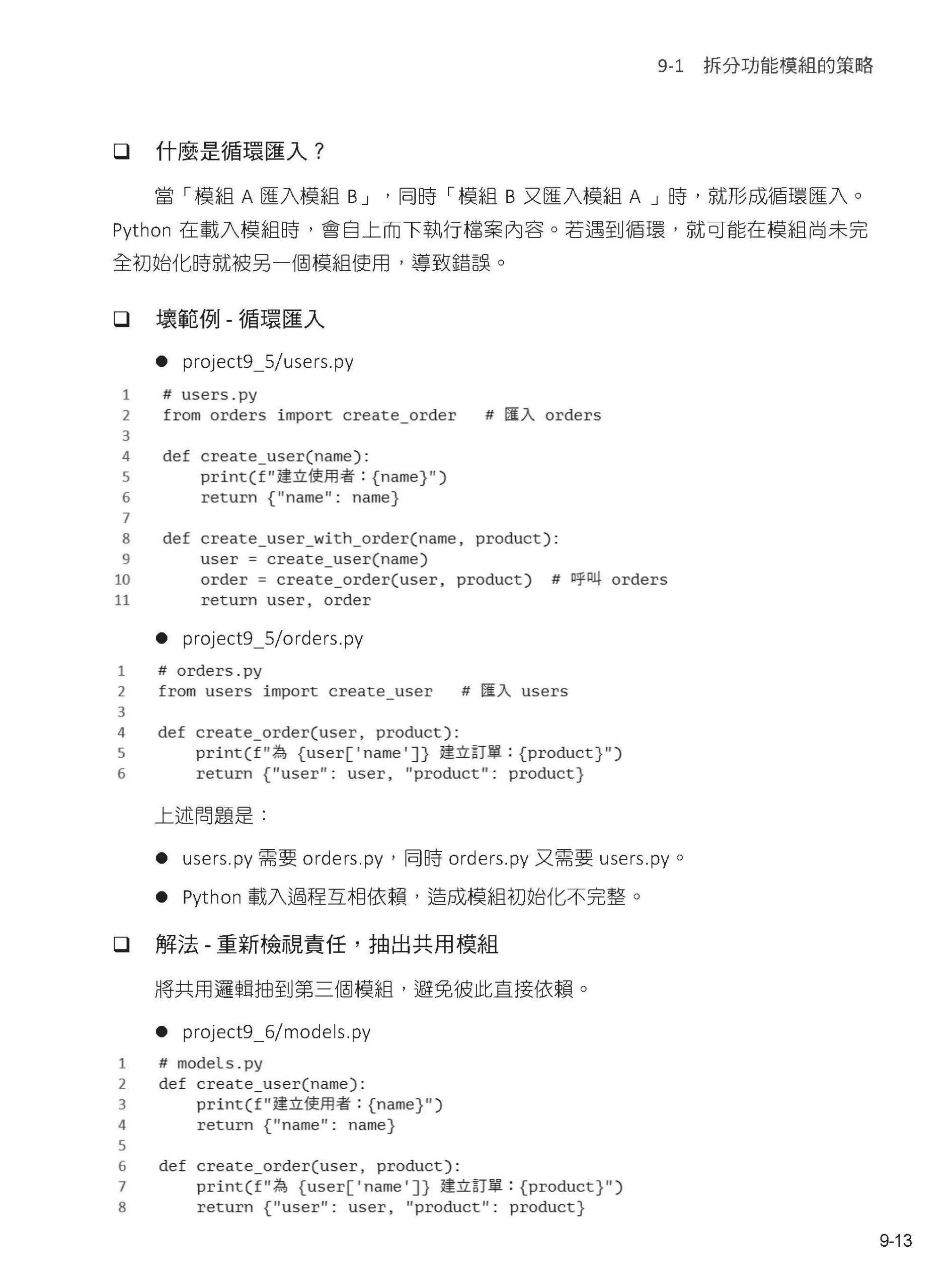 第9章 模組化與檔案結構整理 ▌9-1 拆分功能模組的策略 9-1-1 何謂模組化?為何模組化能降低複雜度 9-1-2 拆分原則 - 單一職責、低耦合、高內聚 9-1-3 何時該拆模組 9-1-4 範例 - 將單一大檔案重構為多個模組 9-1-5 模組間的依賴控制 - 避免循環匯入 ▌9-2 常見小型專案目錄結構範例