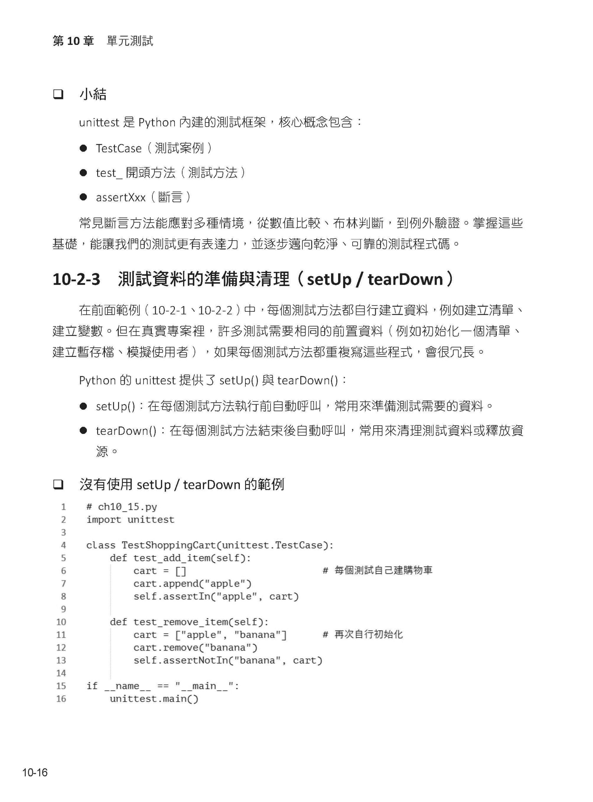 第10章 單元測試 ▌10-1 測試的重要性 10-1-1 為什麼需要測試? 10-1-2 測試的層級與類型簡介 10-1-3 測試在乾淨程式碼中的角色 ▌10-2 使用 unittest 撰寫測試 10-2-1 Python 內建測試框架 unittest 10-2-2 常見斷言方法 10-2-3 測試資料的準備與清理(setUp / tearDown) ▌10-3 使用 pytest 撰寫測試 10-3-1 pytest 的基本用法 10-3-2 pytest 參數 10-3-3 使用 fixture 管理測試資源 10-3-4 pytest 進階功能