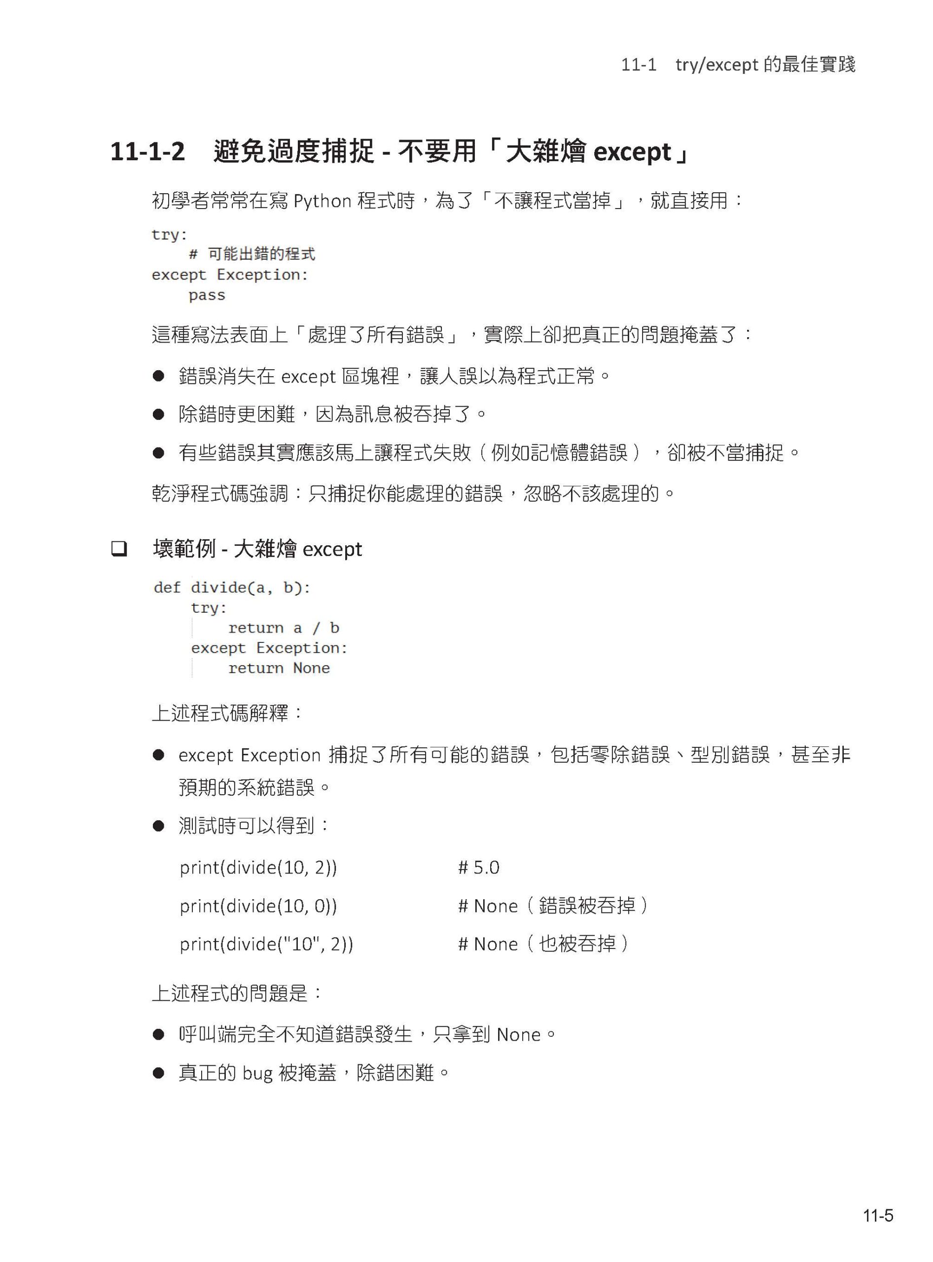 第11章 錯誤處理與例外管理 ▌11-1 try/except 的最佳實踐 11-1-1 try/except/else/finally 基本語法回顧 11-1-2 避免過度捕捉 - 不要用「大雜燴 except」 11-1-3 精準處理 - 捕捉特定例外,而不是所有錯誤 11-1-4 使用 finally 做資源清理 11-1-5 使用 else 區塊分離「正常邏輯」與「例外邏輯」 11-1-6 完整錯誤處理模式實例 ▌11-2 自定義例外的使用場景 11-2-1 什麼時候需要自定義例外? 11-2-2 定義自訂例外類別 11-2-3 加入額外資訊 - 錯誤碼與使用者資訊 11-2-4 專案範例 - 訂單處理系統中的自定義例外 11-2-5 小心過度設計 - 避免建立太多沒意義的例外類別