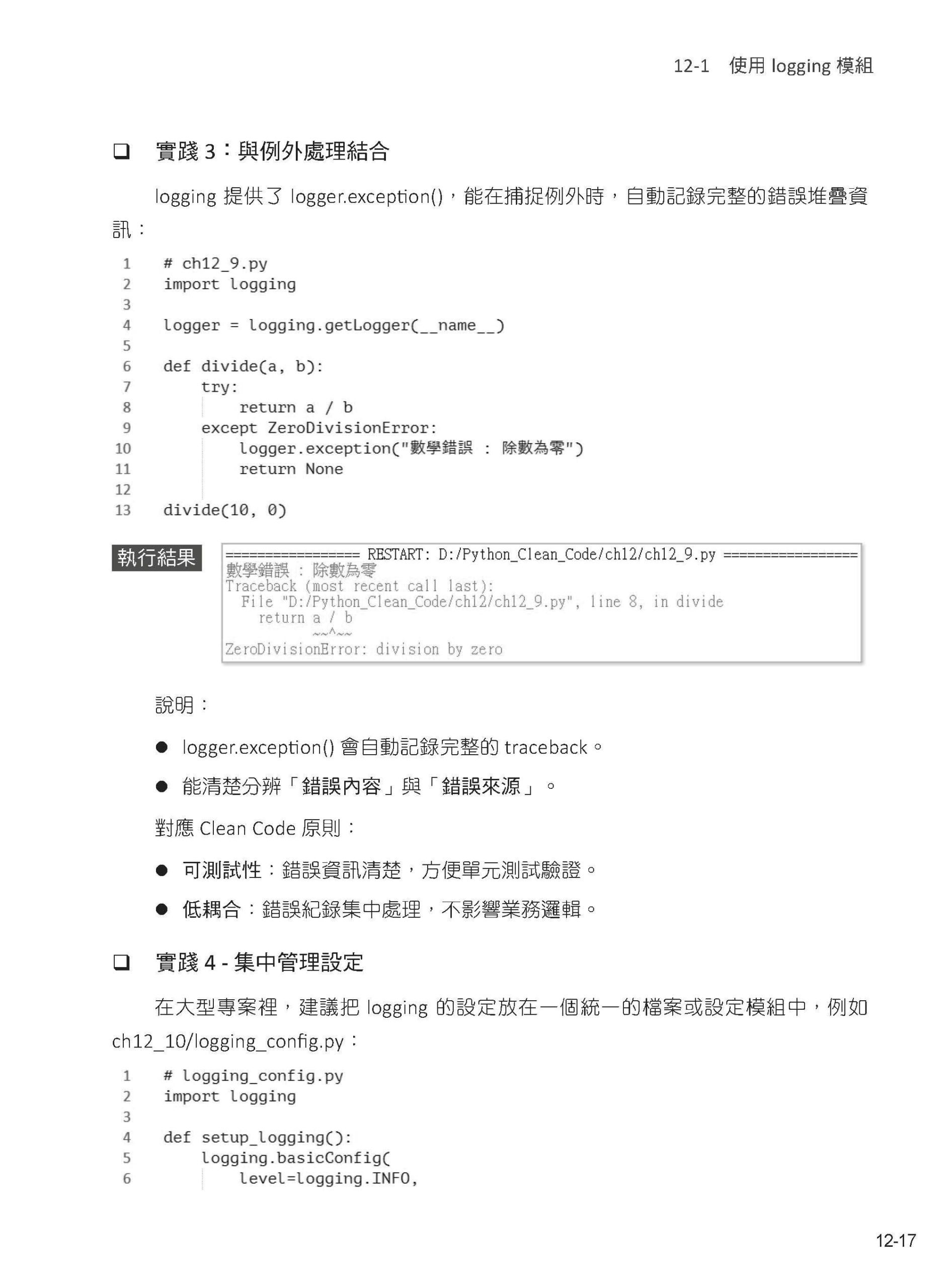 第12章 日誌紀錄與除錯技巧 ▌12-1 使用 logging 模組 12-1-1 為什麼不要只用 print() ? 12-1-2 logging 基本用法 12-1-3 設定輸出格式與檔案紀錄 12-1-4 在專案中的最佳實踐 ▌12-2 除錯的最佳策略與工具 12-2-1 為什麼只靠「印變數」是不夠的? 12-2-2 除錯策略 12-2-3 Python 常見除錯工具
