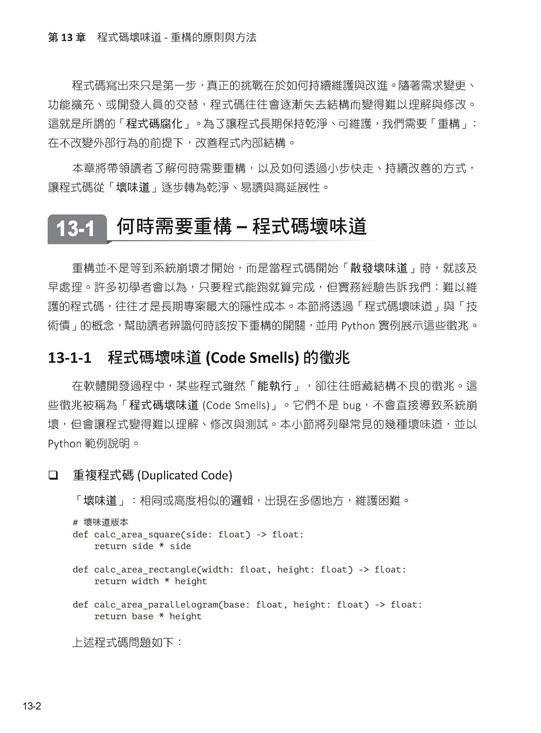 第13章 程式碼壞味道重構的原則與方法 ▌13-1 何時需要重構 – 程式碼壞味道 13-1-1 程式碼壞味道 (Code Smells) 的徵兆 13-1-2 技術債 (Technical Debt) 的警訊 ▌13-2 小步快走 - 由壞變好 13-2-1 重構的核心精神 13-2-2 實踐方法 13-2-3 過長 if – elif - else 的重構 |