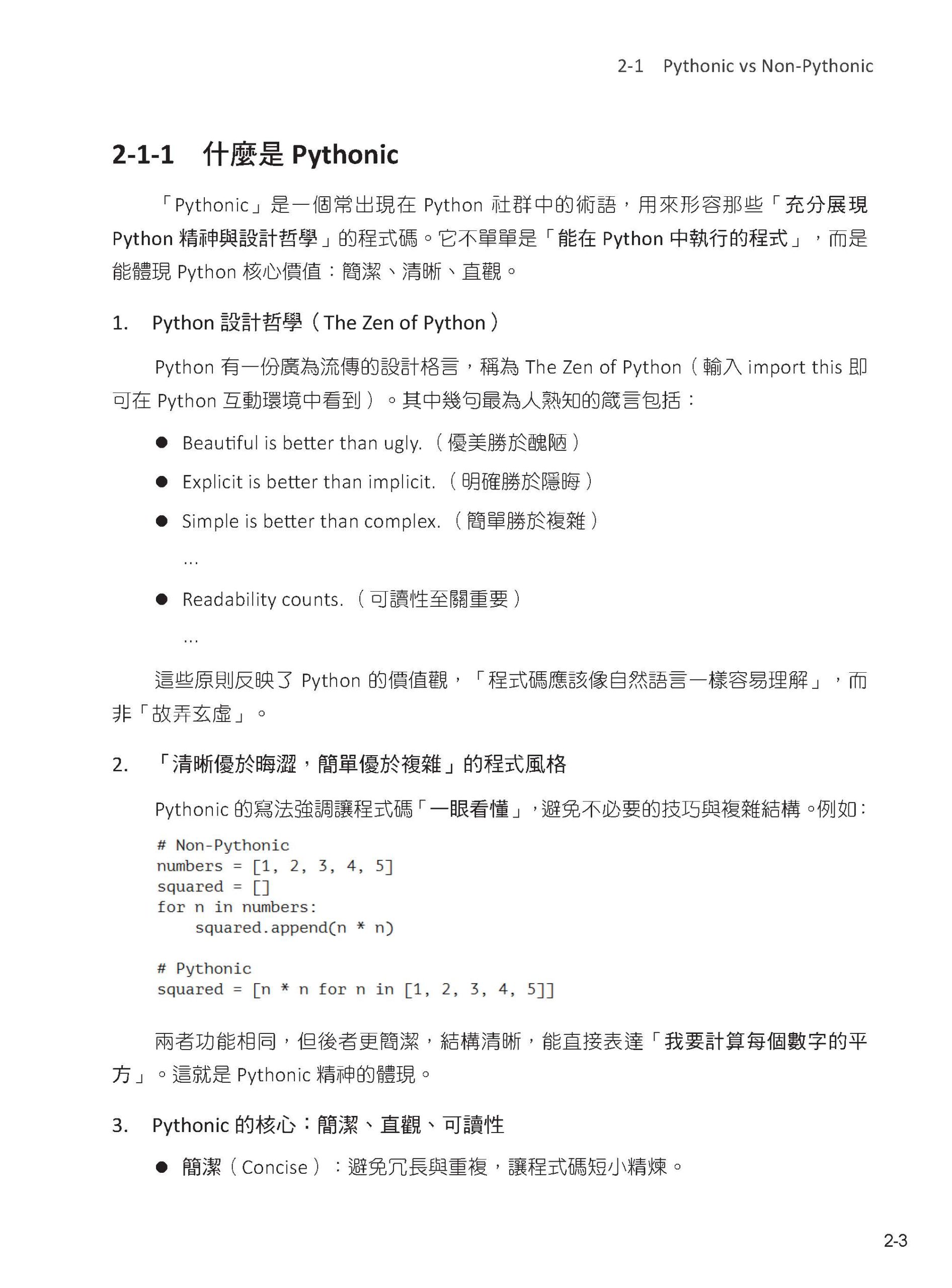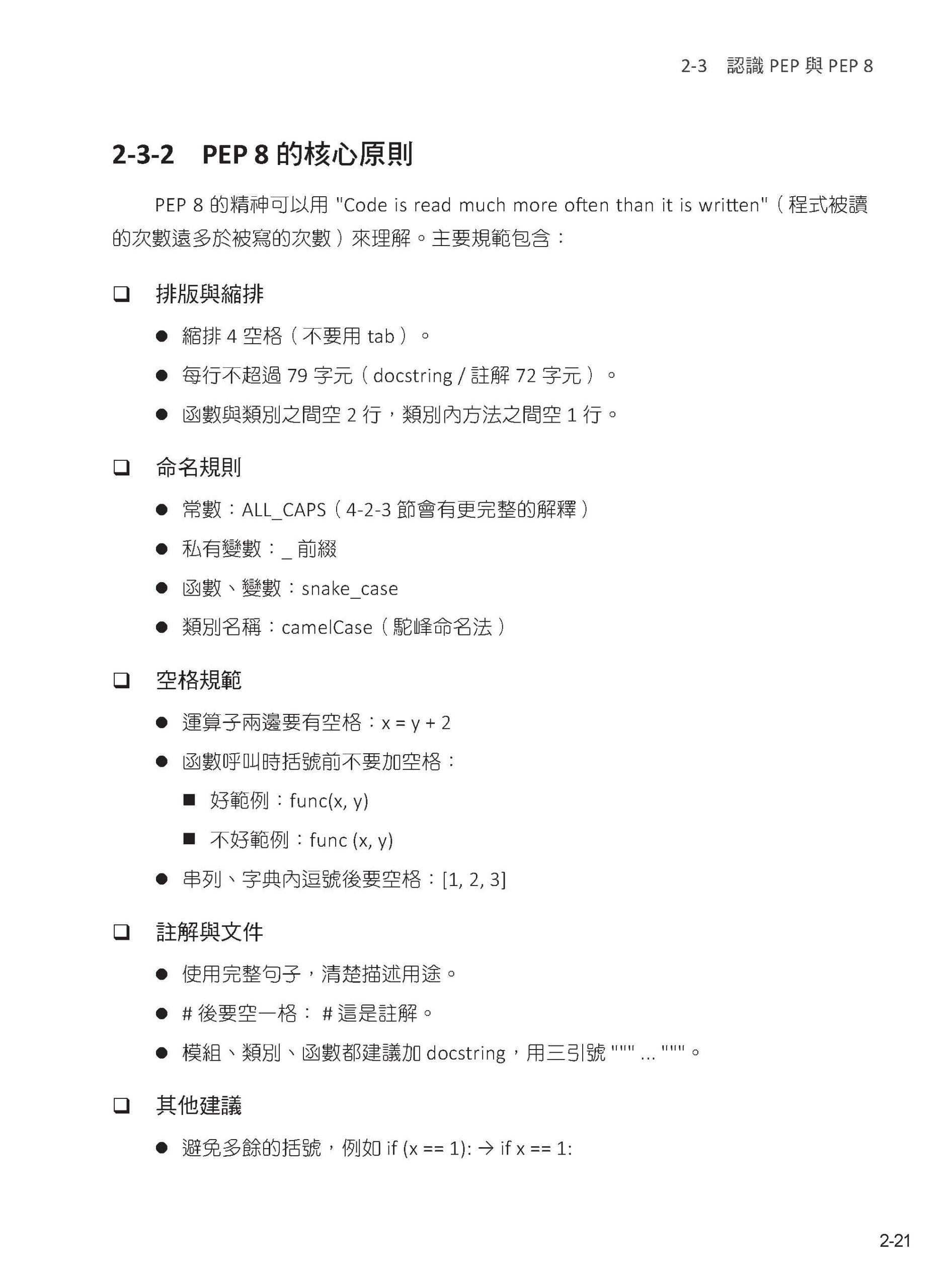 第2章 Python 語言特色與常見誤用 ▌2-1 Pythonic vs Non-Pythonic 2-1-1 什麼是 Pythonic 2-1-2 Non-Pythonic 的典型寫法 2-1-3 常見範例對比 2-1-4 程式邏輯語義化 - any( )/all( ) 2-1-5 為什麼要寫 Pythonic 程式碼 ▌2-2 常見 Python 惡習 2-2-1 什麼是「程式惡習」 2-2-2 認識「耦合度」 2-2-3 認識「內聚」 2-2-4 常見 Python 惡習類型與改進建議 2-2-5 避免惡習的原則 ▌2-3 認識PEP 與PEP 8 2-3-1 PEP 8 名稱緣由 2-3-2 PEP 8 的核心原則 2-3-3 其他與Clean Code 相關的PEP 條目