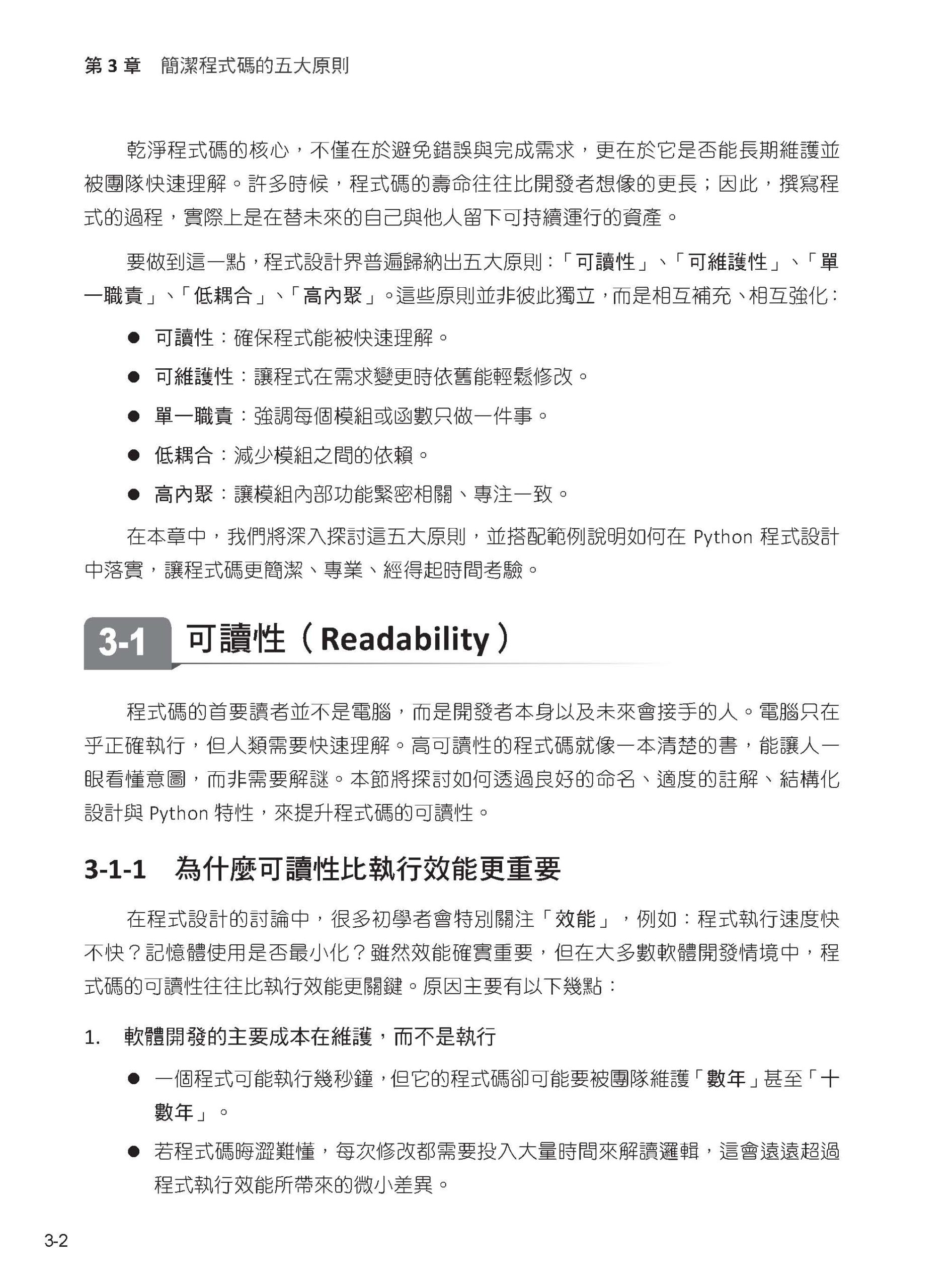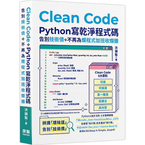 第3章 簡潔程式碼的五大原則 ▌3-1 可讀性(Readability) 3-1-1 為什麼可讀性比執行效能更重要 3-1-2 清楚命名的技巧(變數、函數、類別) 3-1-3 適度使用註解與文件字串(docstring) 3-1-4 善用 Python 語言特性提升可讀性 ▌3-2 可維護性(Maintainability) 3-2-1 什麼是可維護程式碼 3-2-2 減少重複(DRY 原則) 3-2-3 模組化設計與程式結構規劃 3-2-4 自動化測試與版本控制的輔助角色 ▌3-3 單一職責(Single Responsibility Principle, SRP) 3-3-1 SRP 的定義與意義 3-3-2 為什麼「包山包海」的函數是壞習慣 3-3-3 將功能拆分為小型模組的實務方法 ▌3-4 低耦合(Low Coupling) 3-4-1 耦合的定義與分類(資料耦合、控制耦合、全域耦合等) 3-4-2 高耦合帶來的風險與技術債 3-4-3 如何降低耦合 - 參數傳遞、抽象化、依賴注入 3-4-4 Python 範例 - 全域變數依賴 vs. 參數傳遞設計 ▌3-5 高內聚(High Cohesion) 3-5-1 內聚的定義與重要性 3-5-2 高內聚 vs. 低內聚的比較 3-5-3 如何提高內聚 - 單一責任、清楚模組邊界 3-5-4 Python 範例 - 將輸入、邏輯、輸出分離的設計