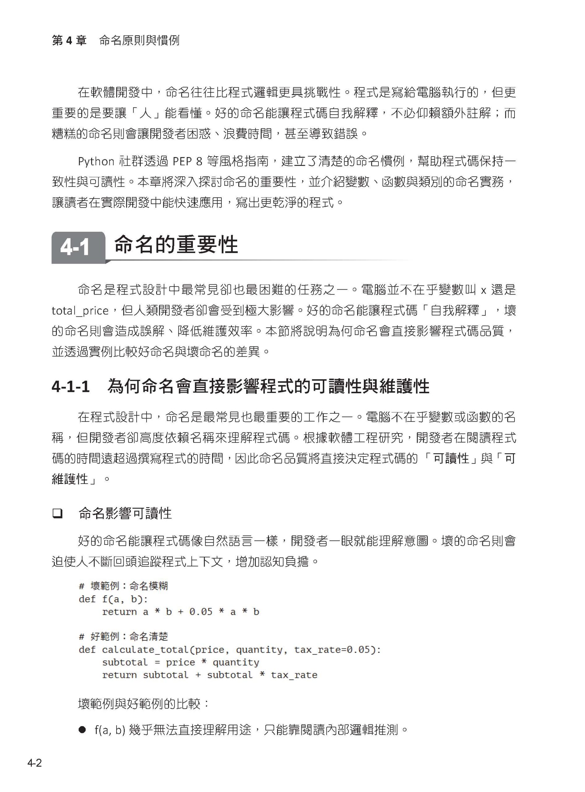 第4章 命名原則與慣例 ▌4-1 命名的重要性 4-1-1 為何命名會直接影響程式的可讀性與維護性 4-1-2 好命名與壞命名的差異比較 4-1-3 「程式即文件」的觀念 - 命名如何取代多餘註解 ▌4-2 變數命名實務 4-2-1 命名原則 - 語意清楚、避免縮寫、保持一致 4-2-2 常見錯誤命名 vs. 改進範例 4-2-3 特殊情境 - 常數與布林變數命名 4-2-4 Python 命名慣例 - snake_case/camelCase ▌4-3 函數命名實務 4-3-1 函數命名應以動詞或動詞片語為主 4-3-2 命名表達「做什麼」,而不是「怎麼做」 4-3-3 範例對比 data() vs. fetch_user_data() ▌4-4 類別命名實務 4-4-1 PEP 8 的PascalCase 的慣例 4-4-2 類別命名以名詞或名詞片語為主 4-4-3 如何讓類別名稱反映「它代表什麼」