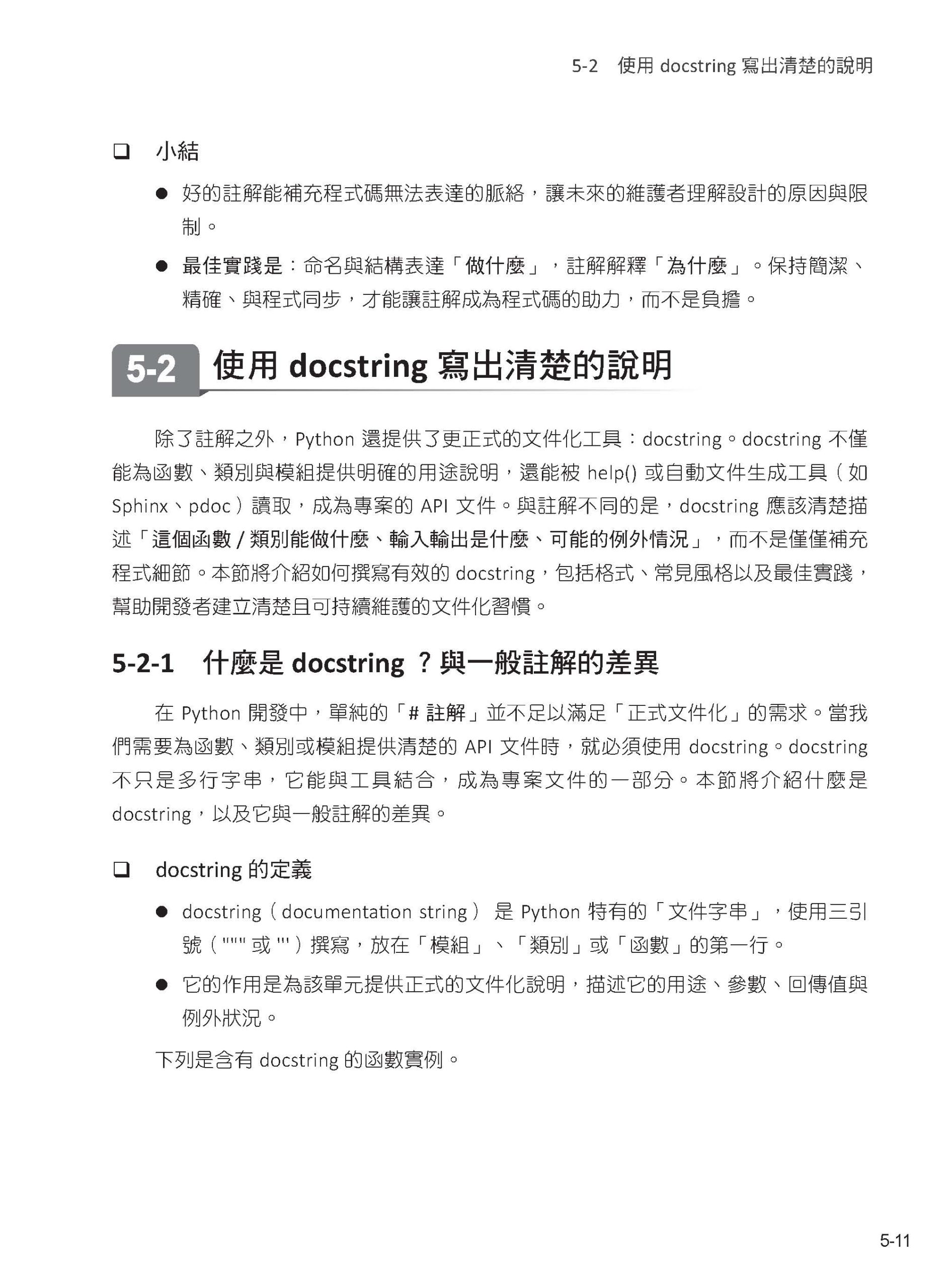 第5章 註解與文件化 ▌5-1 註解該寫在哪裡、不該寫什麼 5-1-1 註解的角色 - 補充「為什麼」,而非重複「做什麼」 5-1-2 該寫的註解 5-1-3 不該寫的註解 5-1-4 註解的最佳實踐 ▌5-2 使用 docstring 寫出清楚的說明 5-2-1 什麼是 docstring ?與一般註解的差異 5-2-2 docstring 的用途 5-2-3 docstring 的撰寫格式 -( 單行、多行、常見風格) 5-2-4 撰寫清楚 docstring 的最佳實踐