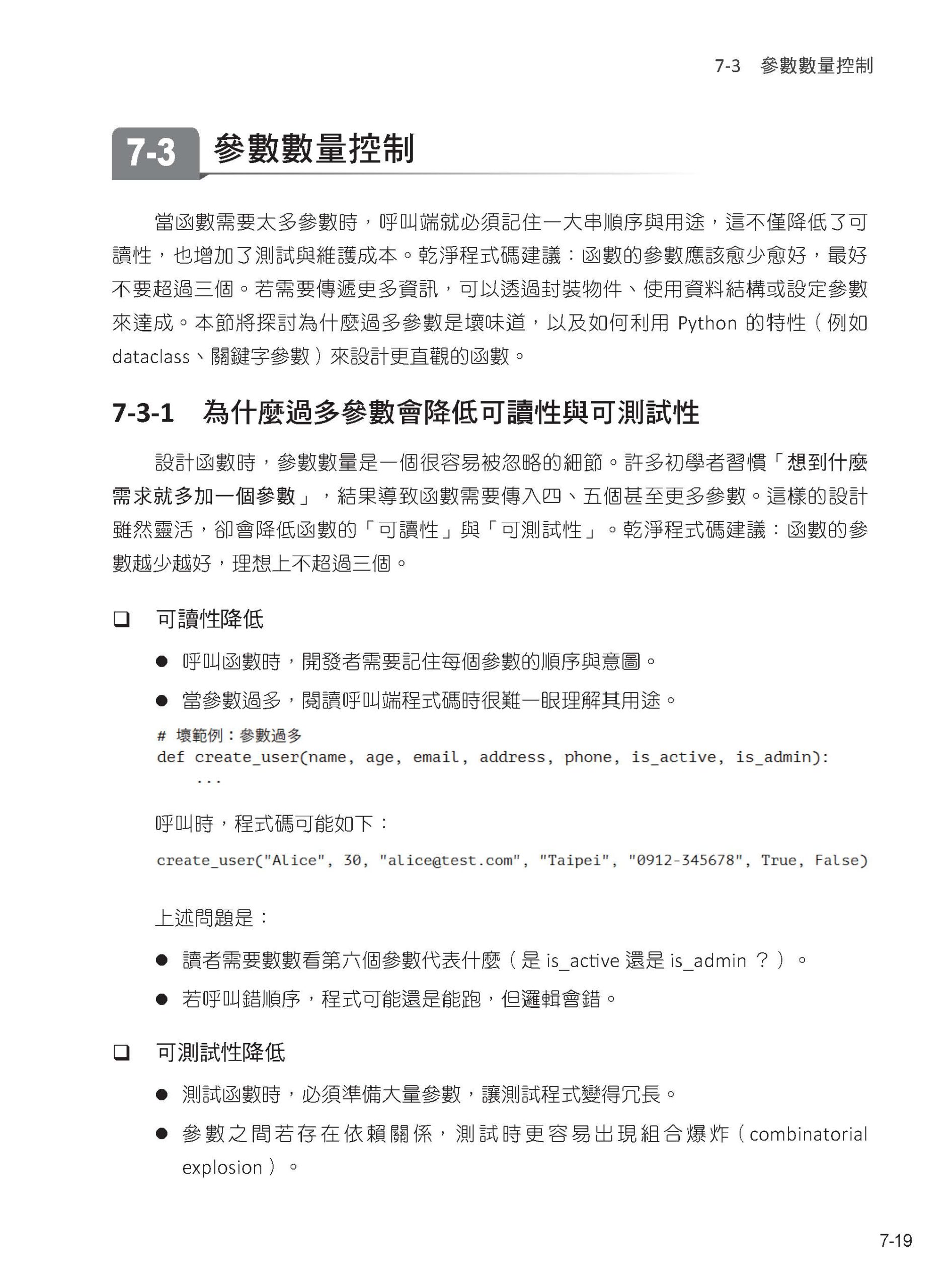 第7章 函數設計原則 ▌7-1 函數應該只做一件事 7-1-1 單一職責原則在函數層級的應用 7-1-2 壞範例 - 包山包海的函數 7-1-3 好範例 - 將函數拆分成小而清楚的單元 7-1-4 優點 - 可讀性、可測試性、可維護性 ▌7-2 避免副作用 7-2-1 什麼是副作用?為什麼要避免? 7-2-2 常見的副作用類型 7-2-3 如何控制副作用 7-2-4 純函數的優勢 ▌7-3 參數數量控制 7-3-1 為什麼過多參數會降低可讀性與可測試性 7-3-2 控制參數數量的實務方法 7-3-3 壞範例 vs 好範例(過多參數的重構對比)