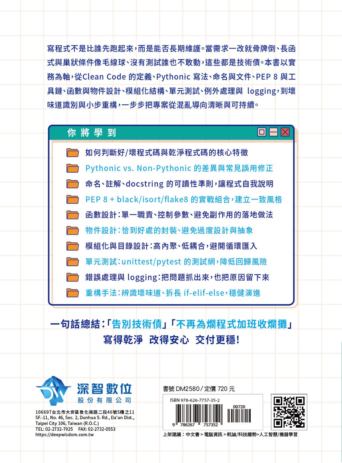 如果你曾為能跑卻難以維護的 Python 專案付出一個又一個深夜,你會懂:真正昂貴的不是 Bug,而是「看不懂、改不動、誰也不敢碰」的程式碼。本書要帶你回到本質– 「寫出讀得懂、改得動、能長久演進的乾淨程式碼(Clean Code)」,讓團隊交接順暢、需求變更不再心驚,最終實現工程師最樸實的願望:「把事做對、準時下班」。