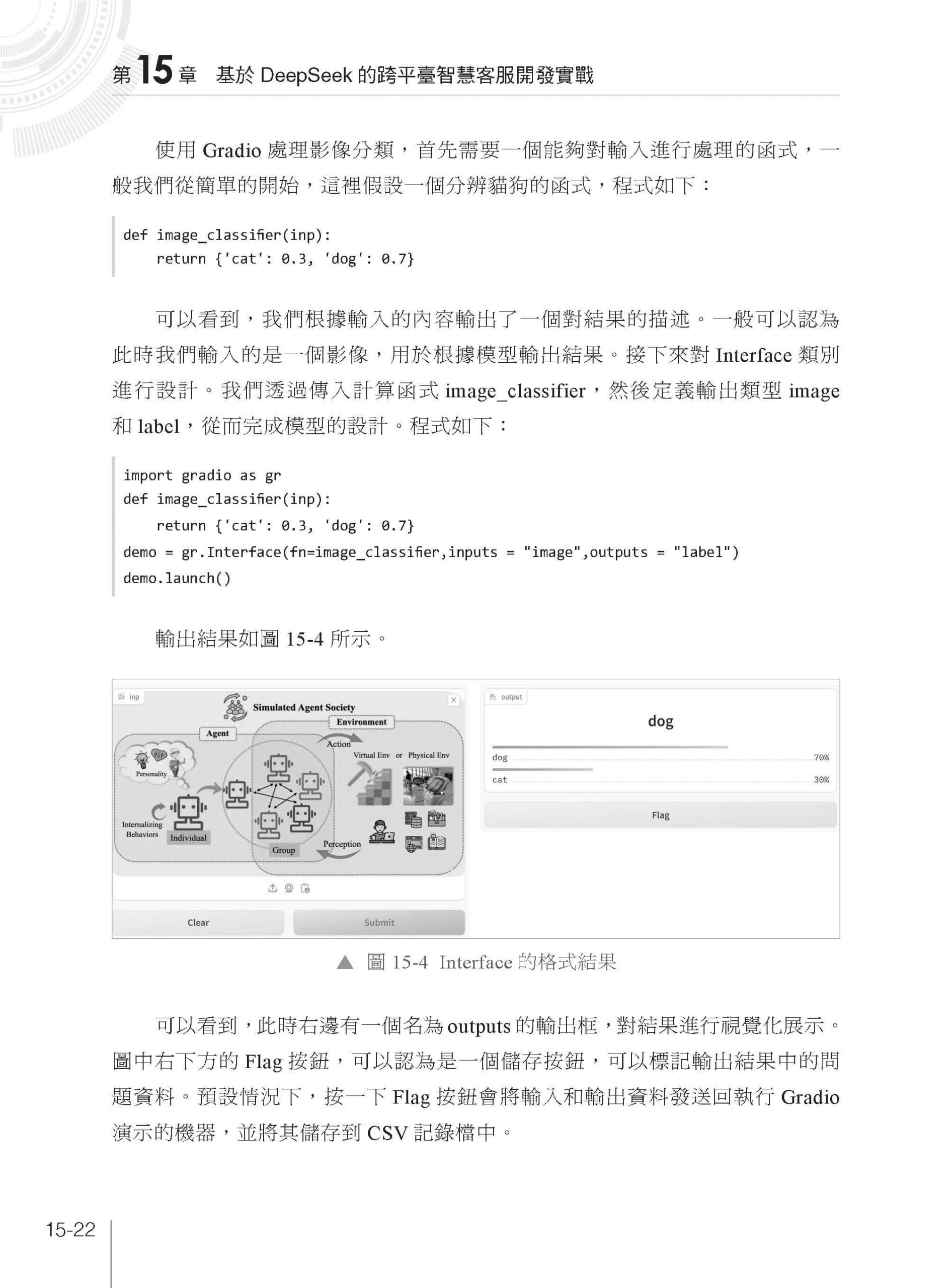 ▌第15 章 基於DeepSeek 的跨平臺智慧客服開發實戰 15.1 智慧客服的設計與基本實現 15.1.1 智慧客服架設想法 15.1.2 商品介紹資料的格式與說明 15.1.3 基於DeepSeek 的智慧客服設計 15.2 帶有跨平臺使用者端的智慧客服開發實戰 15.2.1 跨平臺使用者端Gradio 使用詳解 15.2.2 一個簡單的Gradio 範例 15.2.3 基於DeepSeek 的跨平臺智慧客服實現 15.3 本章小結 |