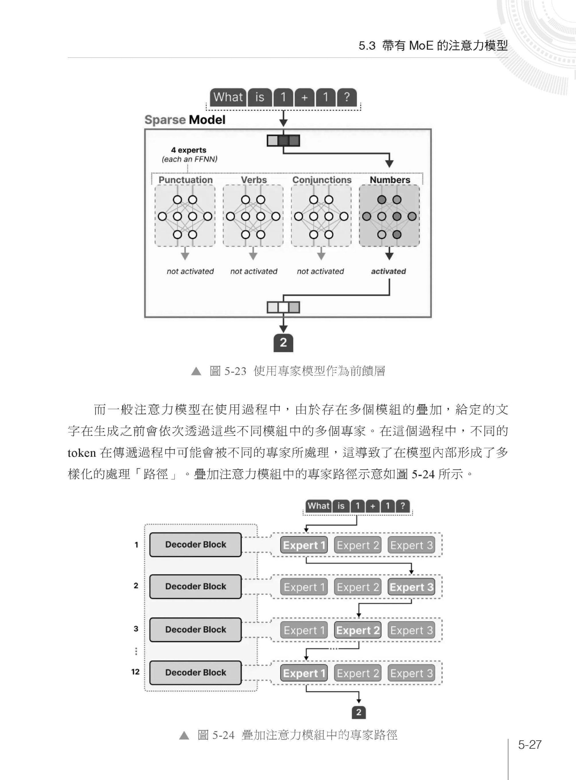 ▌第5 章 注意力機制詳解之高級篇 5.1 替代前饋層的混合專家模型詳解 5.1.1 混合專家模型的基本結構 5.1.2 混合專家模型中的「專家」與「調控」程式實現 5.2 高級篇實戰1:基於混合專家模型的情感分類實戰 5.2.1 基於混合專家模型的MoE 評論情感分類實戰 5.2.2 混合專家模型中負載平衡的實現 5.2.3 修正後的MoE 門控函式 5.3 帶有MoE 的注意力模型 5.3.1 注意力機制中的前饋層不足 5.3.2 MoE 天然可作為前饋層 5.3.3 結合MoE 的注意力機制 5.4 高級篇實戰2:基於通道注意力的影像分類 5.4.1 資料集的準備 5.4.2 影像辨識模型的設計 5.4.3 結合通道注意力圖像分類模型 5.4.4 影像辨識模型SENet 的訓練與驗證 5.5 高級篇實戰3:基於MoE 與自注意力的影像分類 5.5.1 基於注意力機制的ViT 模型 5.5.2 Patch 和Position Embedding 5.5.3 視覺化的V-MoE 詳解 5.5.4 V-MoE 模型的實現 5.5.5 基於影像辨識模型V-MoE 的訓練與驗證 5.5.6 使用已有的函式庫套件實現MoE 5.6 本章小結