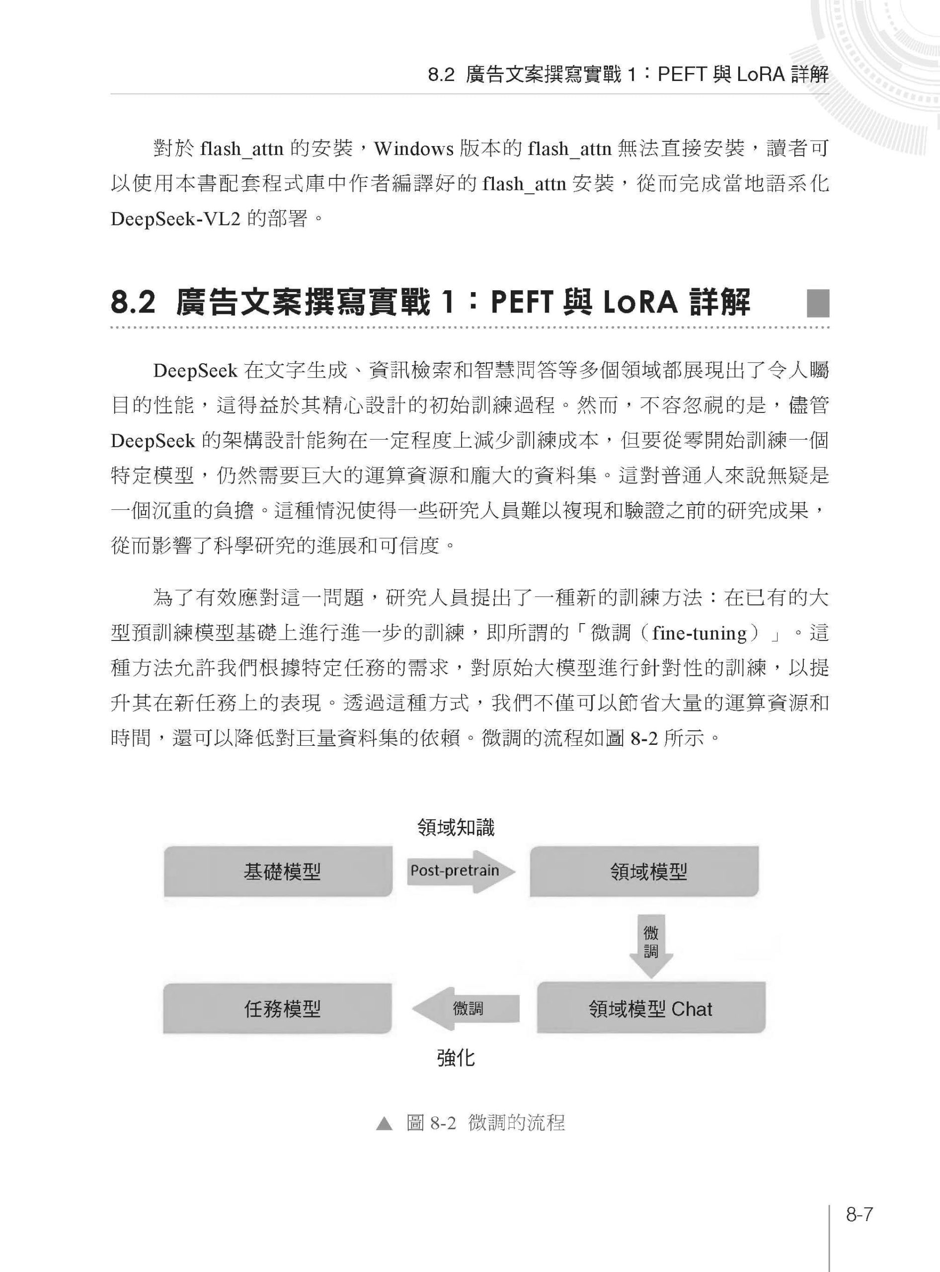 ▌第8 章 廣告文案撰寫實戰:多模態DeepSeek 當地語系化部署與微調 8.1 多模態DeepSeek-VL2 當地語系化部署與使用 8.1.1 Linux 版本DeepSeek-VL2 程式下載與影像問答 8.1.2 Windows 版本DeepSeek-VL2 程式下載 8.2 廣告文案撰寫實戰1:PEFT 與LoRA 詳解 8.2.1 微調的目的:讓生成的結果更聚焦於任務目標 8.2.2 微調經典方法LoRA 詳解 8.2.3 調配DeepSeek 微調的輔助函式庫PEFT 詳解 8.3 廣告文案撰寫實戰2:當地語系化DeepSeek-VL2 微調 8.3.1 資料的準備 8.3.2 微調模型的訓練 8.3.3 微調模型的使用與推斷 8.4 本章小結