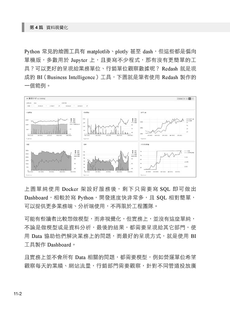 ▍第4 篇 資料視覺化 ►11 視覺化工具 11.1 什麼是視覺化? 11.2 Redash 11.3 Redash 帳號設定 11.4 資料庫連接 11.5 匯入資料 11.6 製作第一個圖表 11.7 第一個 Dashboard 11.8 設定下拉式選單 11.9 其他 BI 工具