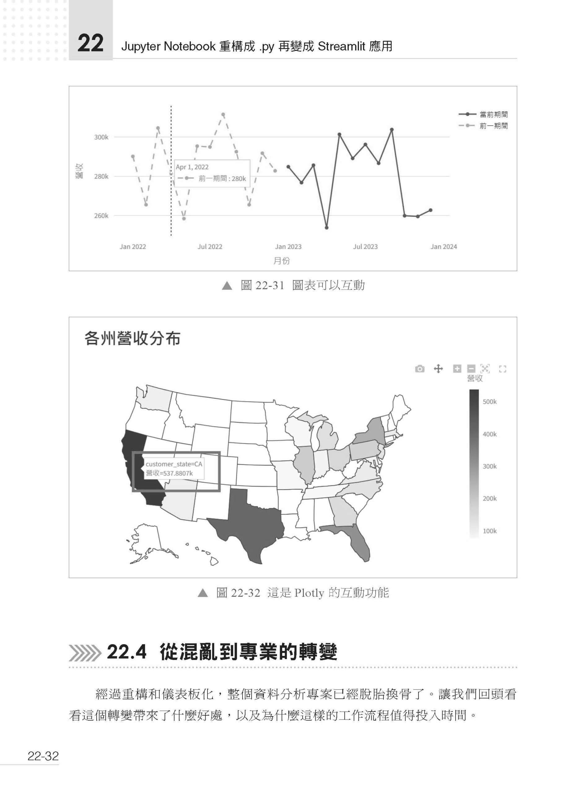 ▌第6 部分:完整實例篇 第22 章 Jupyter Notebook 重構成 .py 再變成Streamlit 應用 22.1 Jupyter Notebook 方便驗證但不適合大型專案 22.2 使用Claude Code 重構Notebook 22.3 從Notebook 到Streamlit 儀表板 22.4 從混亂到專業的轉變 22.5 佈署到Streamlit 雲端平台 22.6 本章小結