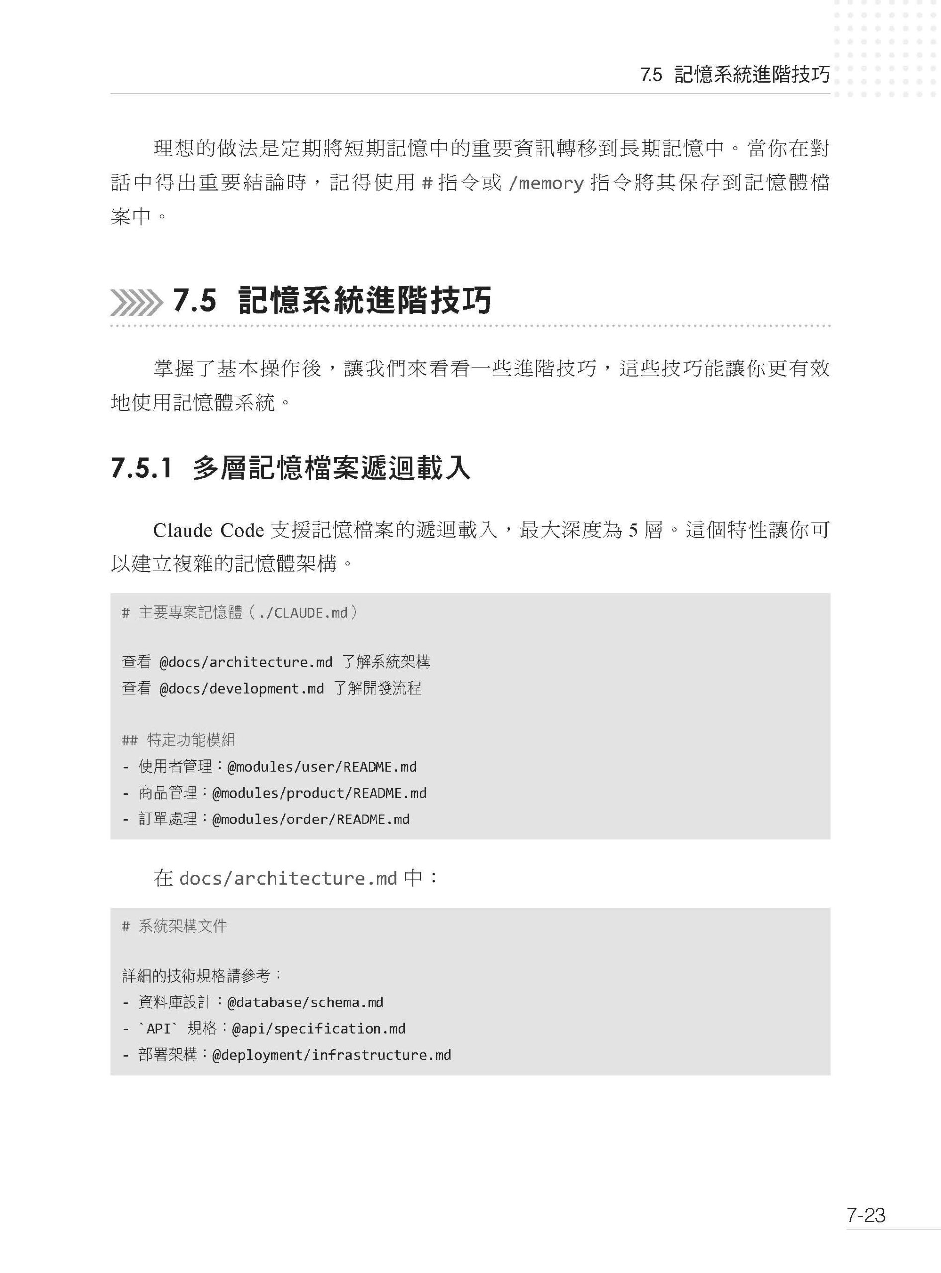 第7 章 CLAUDE.md 與記憶體管理 7.1 CLAUDE.md 記憶檔案系統核心 7.2 記憶檔案結構設計與管理 7.3 記憶系統實戰操作 7.4 專案認知與上下文管理 7.5 記憶系統進階技巧 7.6 本章小結