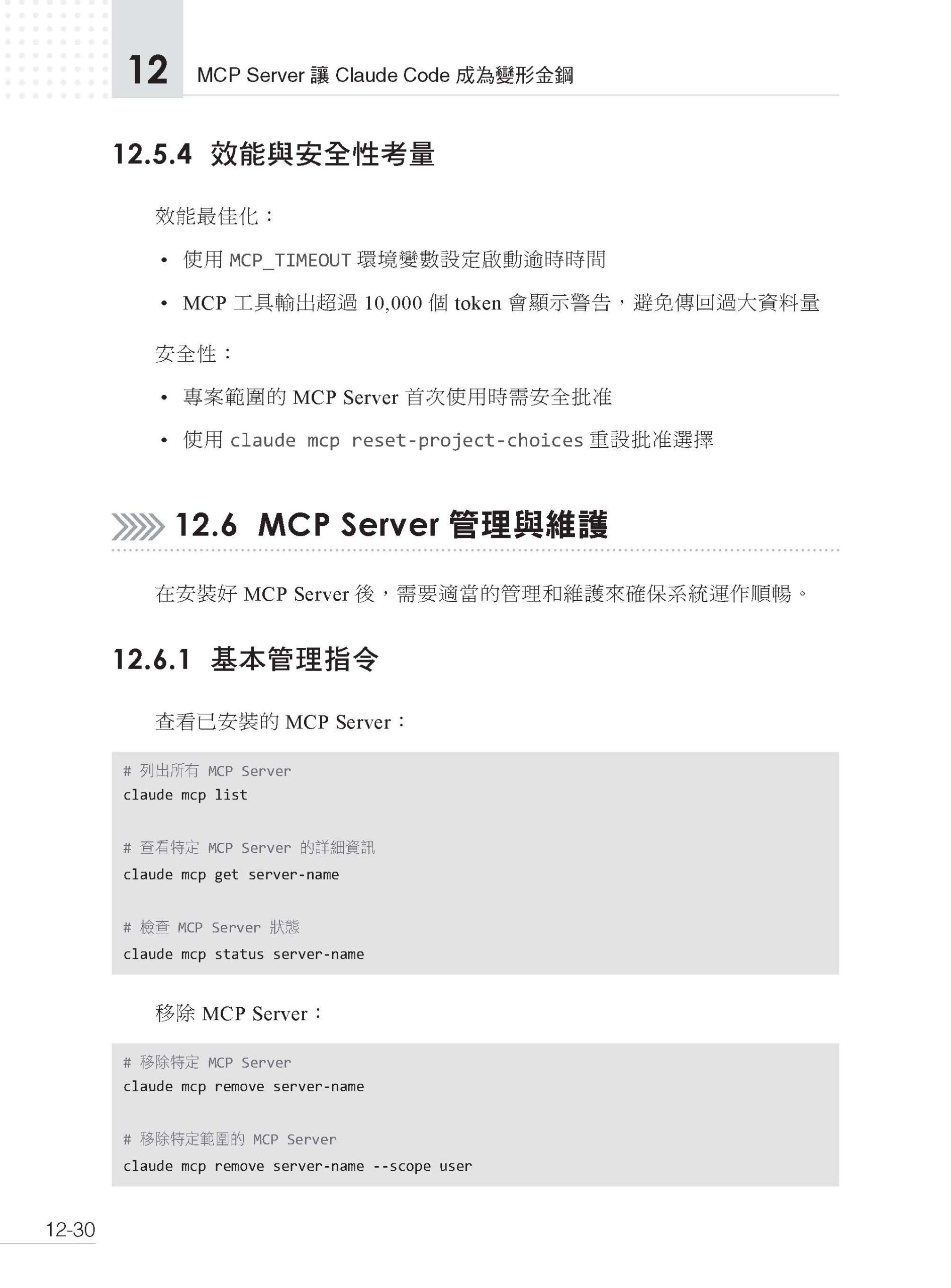 ▌第3 部分:進階篇 第12 章 MCP Server 讓 Claude Code 成為變形金鋼 12.1 完整MCP Server 操作範例 12.2 為什麼需要MCP ? 12.3 大概介紹一下MCP 的原理 12.4 在Claude Code 中安裝MCP Server 12.5 MCP Server 範圍管理策略 12.6 MCP Server 管理與維護 12.7 MCP 其它的相關功能 12.8 本章小結