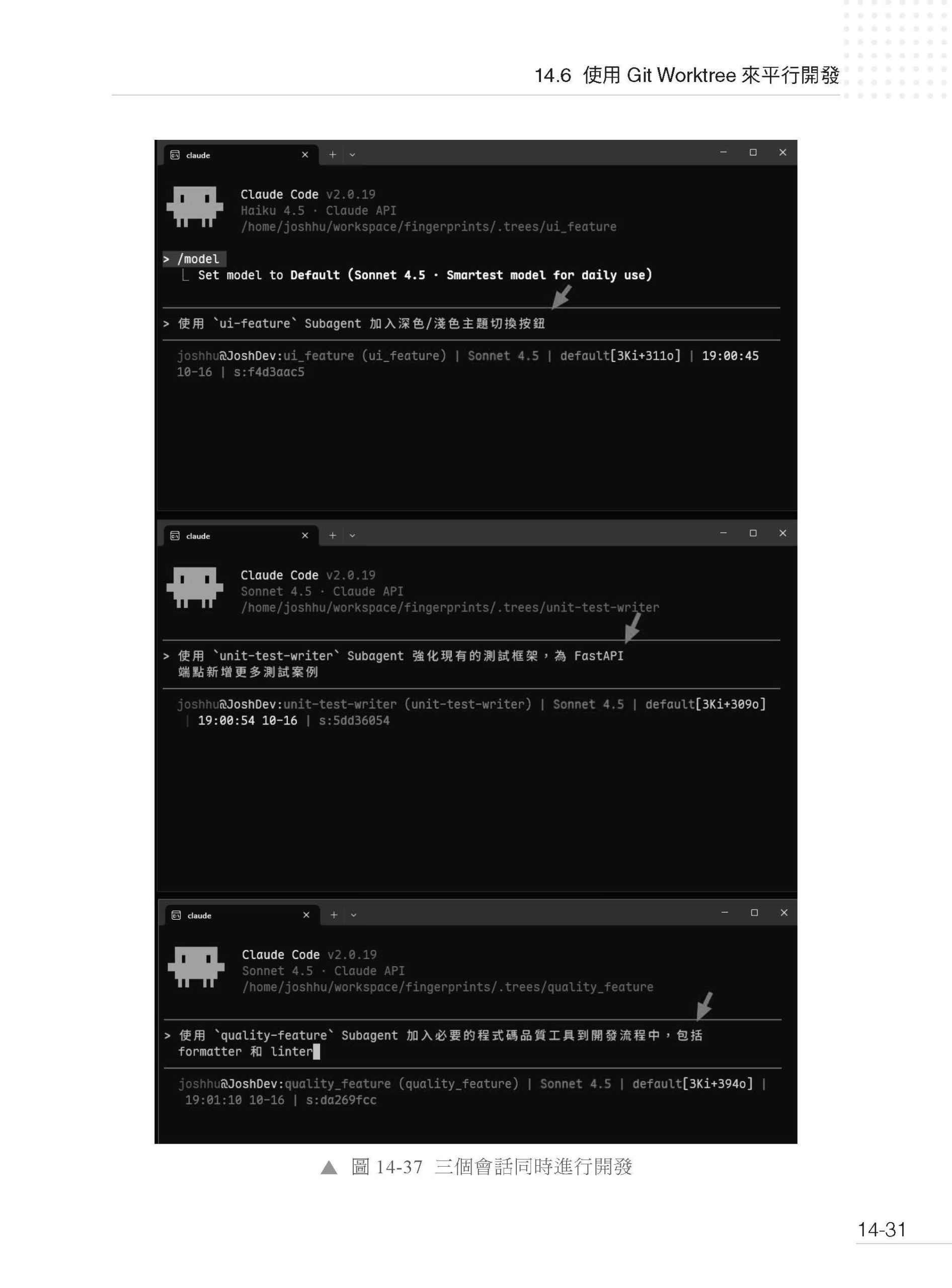 第14 章 Subagent 子代理協作系統 14.1 什麼是Subagent ? 14.2 Subagent 的設定檔案 14.3 管理Subagent 14.4 有效使用Subagent 14.5 實用的Subagent 範例 14.6 使用Git Worktree 來平行開發 14.7 使用現成的SubAgent 14.8 本章小結